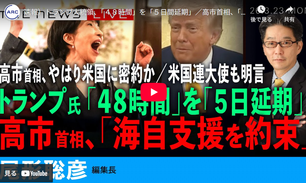 ◆速報)トランプ大統領、「48時間」を「5日間延期」/高市首相、「海自の派遣を約束」と米高官も/高市首相、やはり米国と密約か、米国連大使も明言(尾形聡彦)【3/23(月) 21:30~ ライブ】