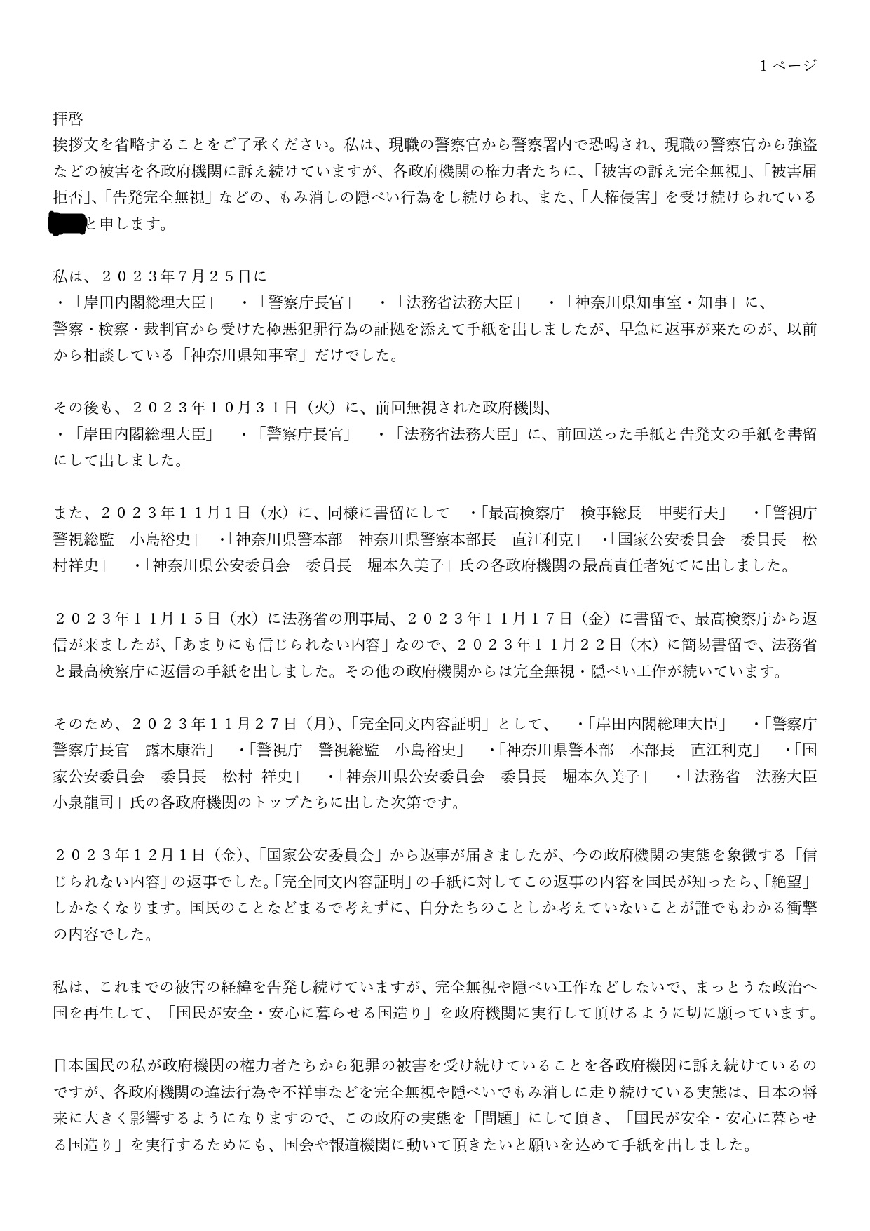 各政府機関へ手紙1