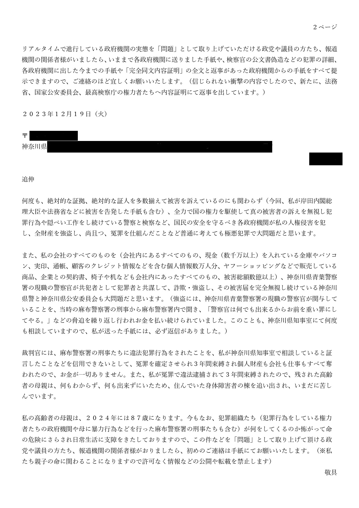 高齢の母を脅迫した手紙1