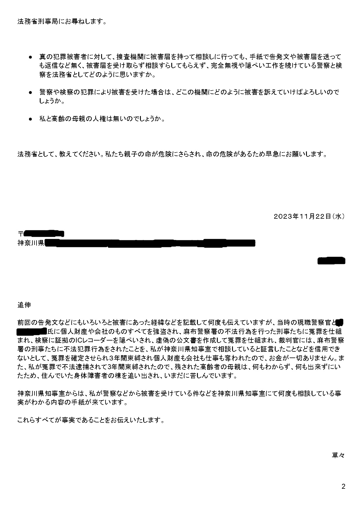 2023年11月22日、法務省から返信があった手紙の内容があまりにも国民の被害の声を聞こうともしない内容だったので、再度、法務省へ手紙をだしました。