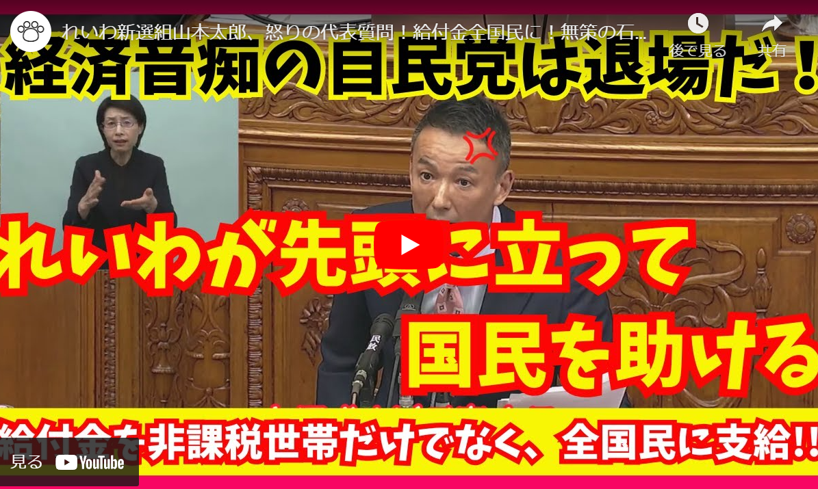 ◆れいわ新選組山本太郎、怒りの代表質問!給付金全国民に!無策の石破総理を猛批判