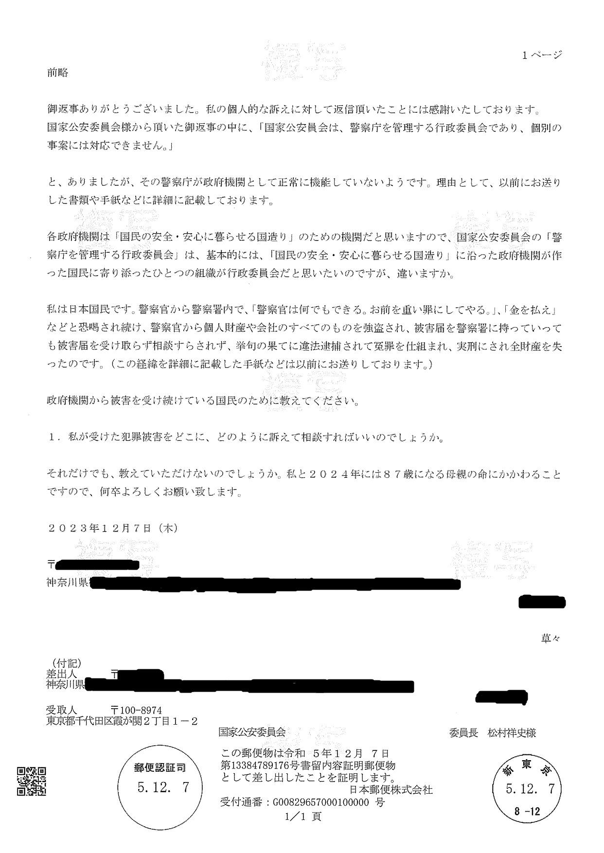 2023年12月1日に、国家公安委員会様から返事を頂いた手紙の内容に納得が出来ませんでしたので、内容証明にて、2023年12月7日に再度、手紙をだしました。