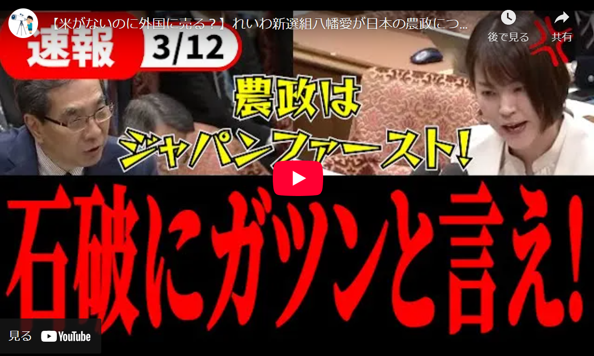 ■【米がないのに外国に売る?】れいわ新選組八幡愛が日本の農政について江藤農林水産大臣に徹底追及!
