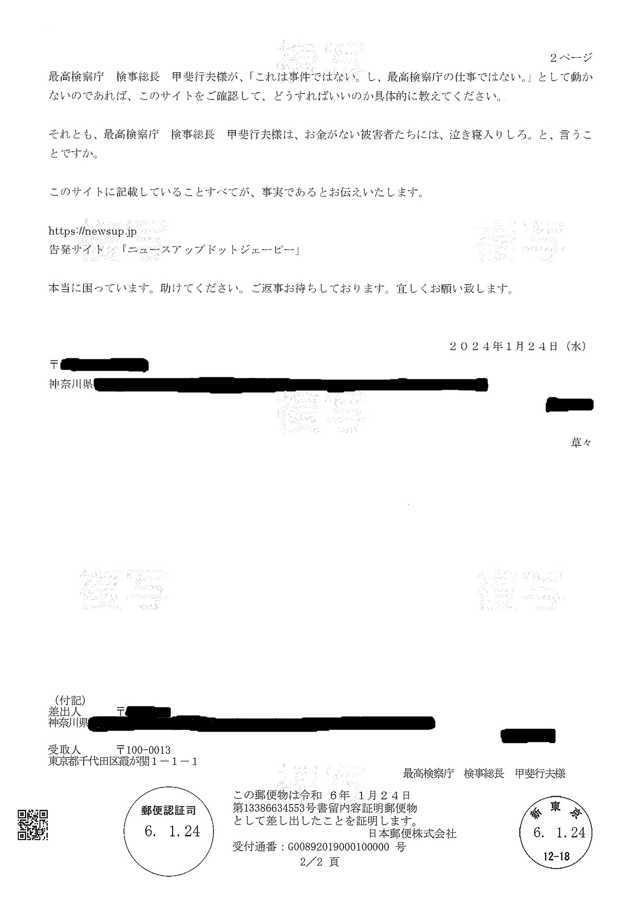 そのため、再度、最高検察庁へ返事の手紙を内容証明にて出しました。私の心の叫び・訴えです。