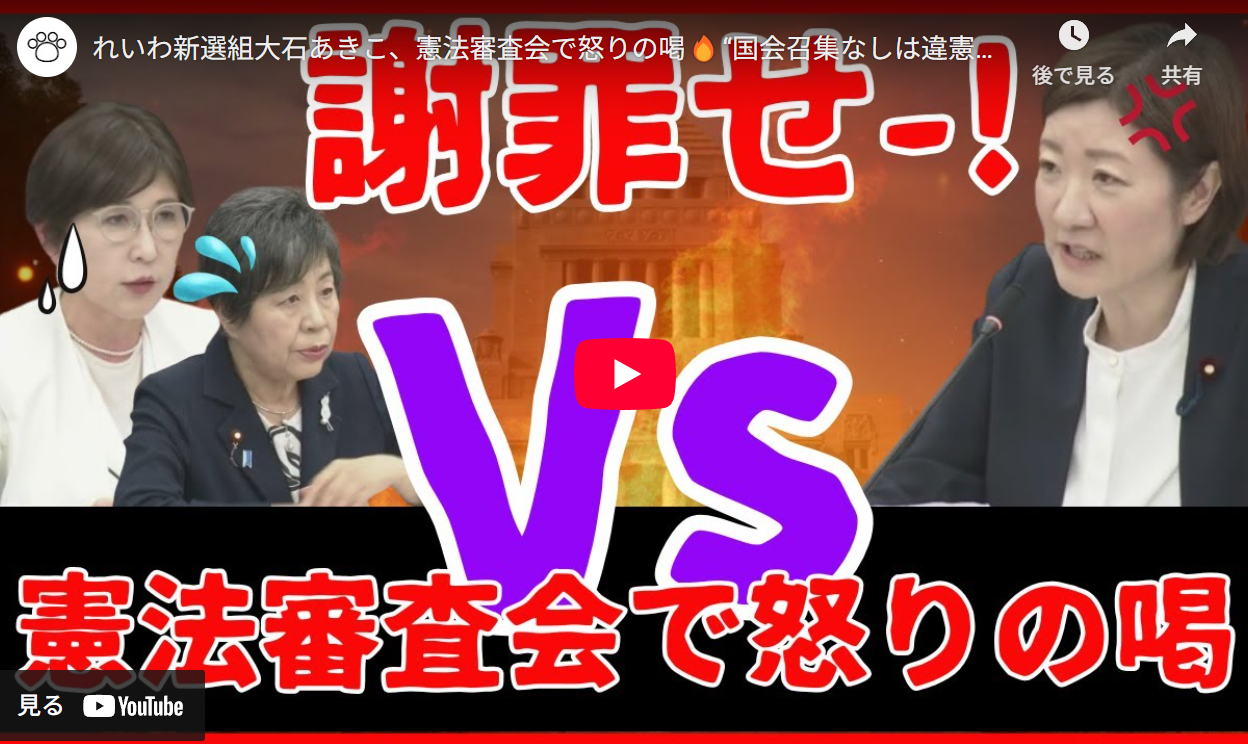 ■れいわ新選組大石あきこ、憲法審査会で怒りの喝🔥“国会召集なしは違憲!自民は謝罪せー!※動画を再生するときには、音量を小さくしてから調節して閲覧してくださいませ。・コメント・投稿