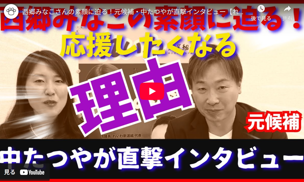 ■西郷みなこさんの素顔に迫る!元候補・中たつやが直撃インタビュー【れいわ新選組】※動画を再生するときには、音量を小さくしてから調節して閲覧してくださいませ。・コメント・投稿