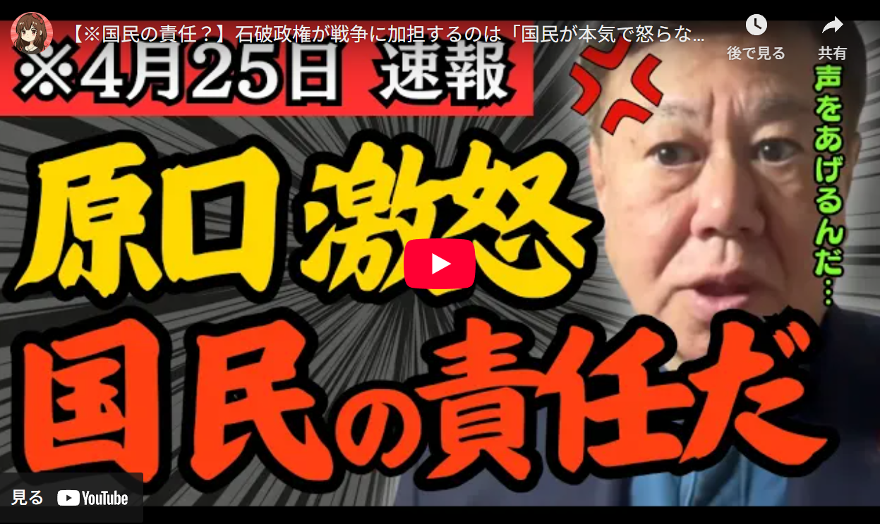 ■【※国民の責任?】石破政権が戦争に加担するのは「国民が本気で怒らない」から?原口一博が”このままだと命が危ない”と警告を鳴す