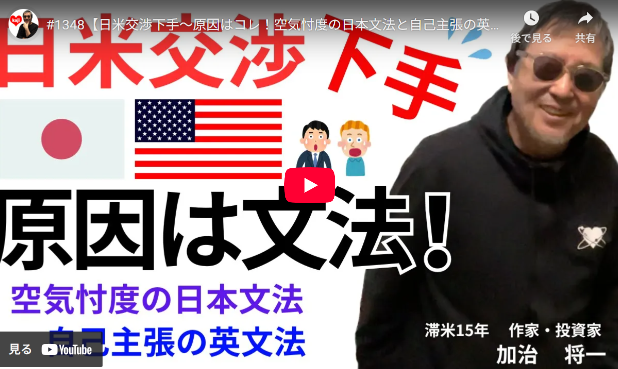 ◆【日米交渉下手〜原因はコレ!空気忖度の日本文法と自己主張の英文法】状況説明を優先させる文法が空気にビクつく性格を生む日本語と、自分は〇〇をする!が最初に来る英語-masakazu kaji-