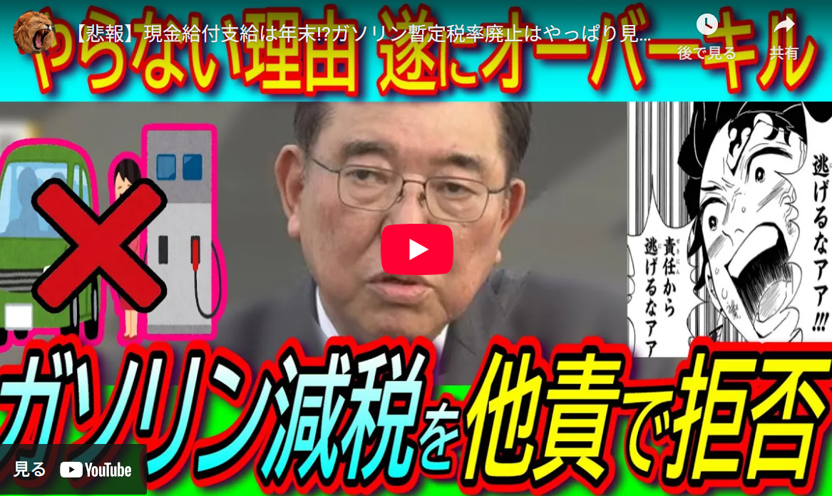 ◆【悲報】現金給付支給は年末!?ガソリン暫定税率廃止はやっぱり見送り!
