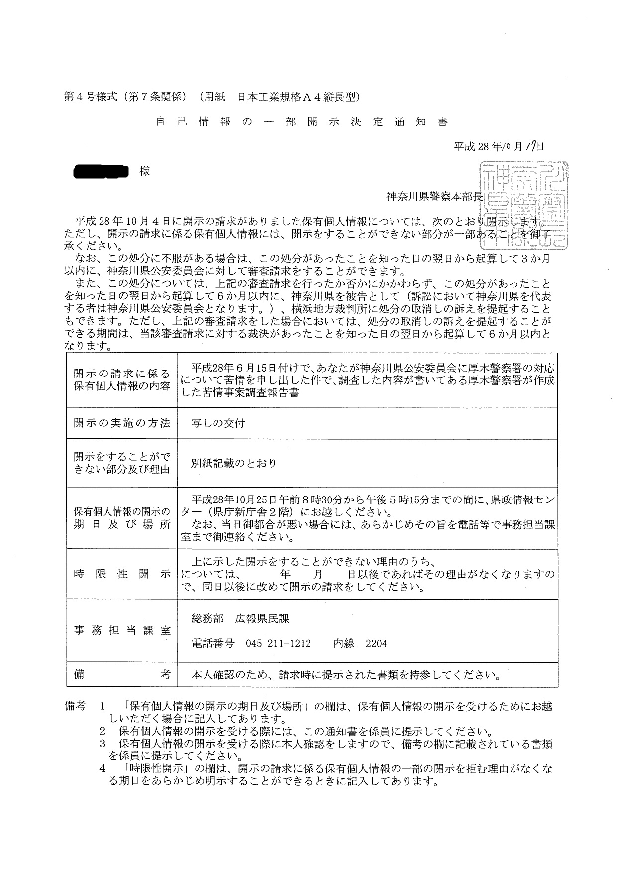 厚木警察署の開示決定通知書1