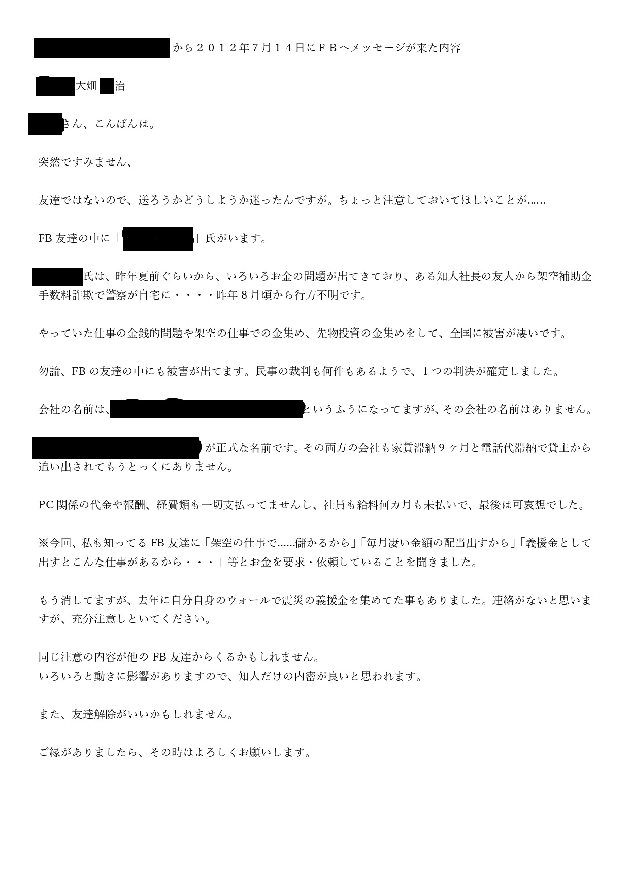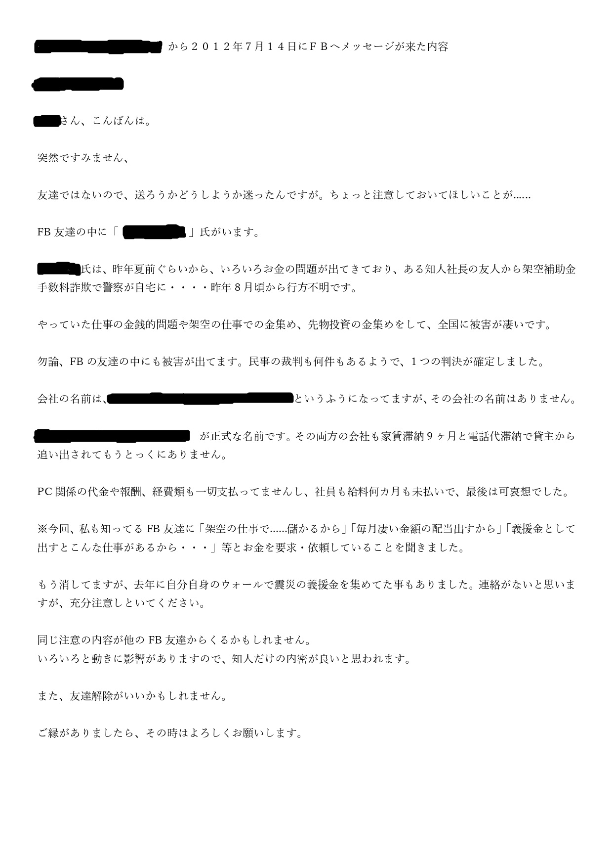 このようなFB・SNSを使っての詐欺・誹謗中傷行為を、「拡散」、したやつらは、法律的にも共犯者になります。