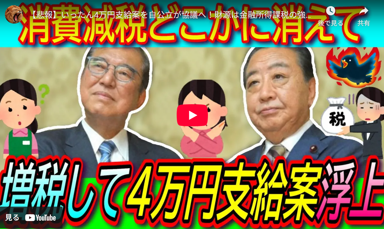 ■【悲報】いったん4万円支給案を自公立が協議へ!財源は金融所得課税の強化つまり増税!