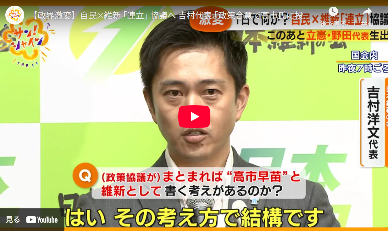 ■【政界激変】自民✕維新 「連立」 協議へ 吉村代表 「政策合意で高市氏に投票する」1日でいったい何が?【サン!シャインニュース】
