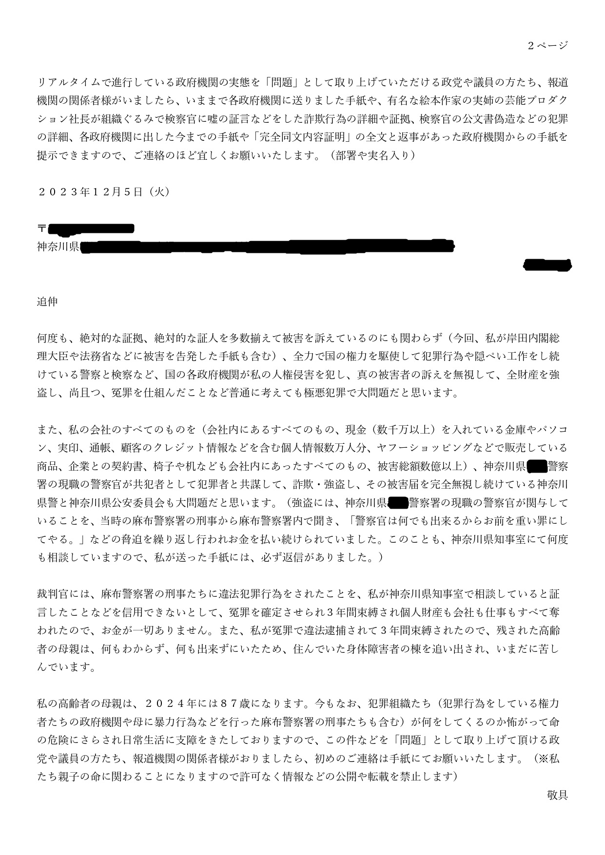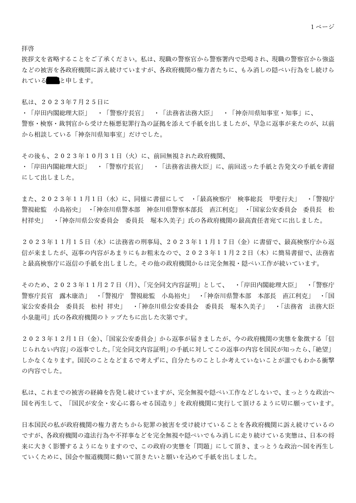 2023年12月5日(火)に、日本放送協会(NHK)の会長 稲葉延雄様へ、腐敗している政府や権力者たちの実態は、日本の国民が知らないといけない事実なので、問題として報道してもらいたく、訴えた手紙の内容です。