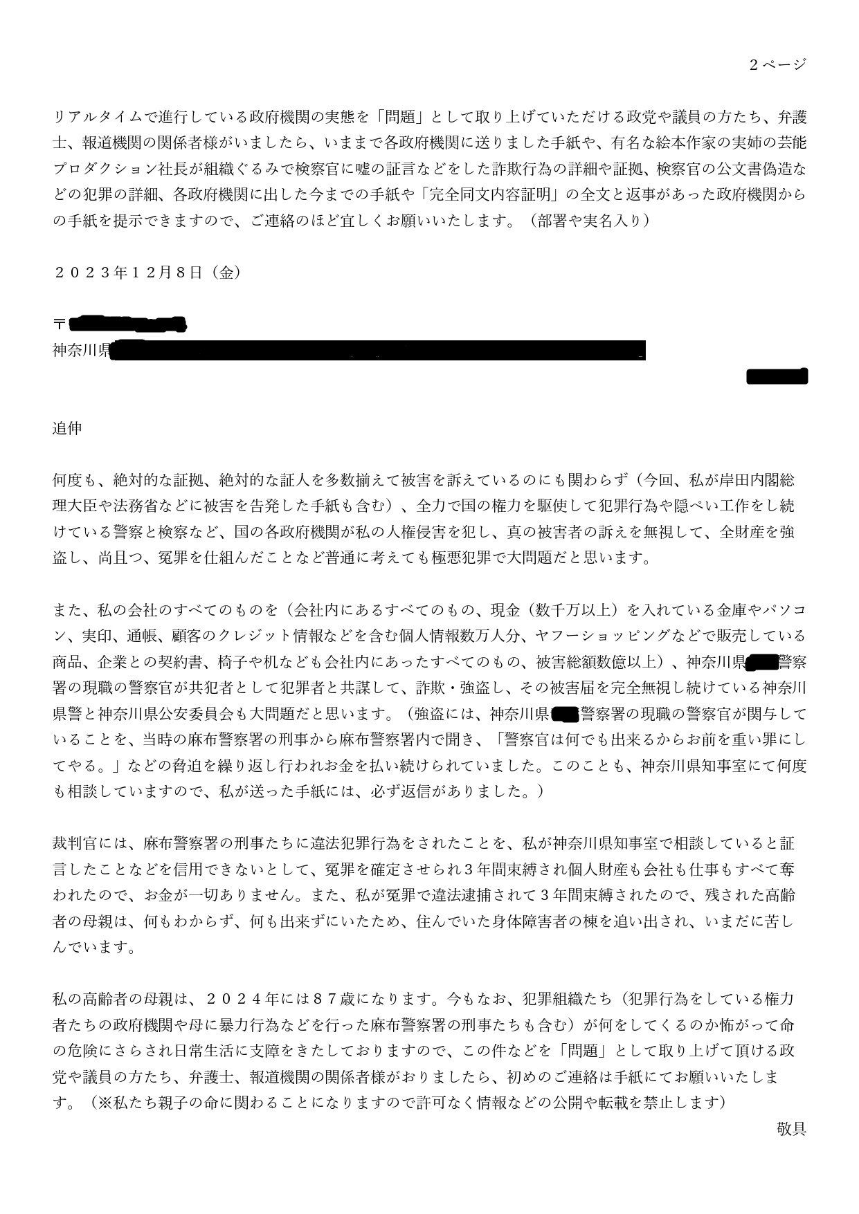 高齢の母を脅迫した手紙1