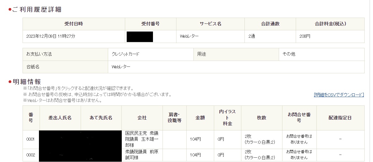 2023年12月9日(土)に、WEBレターを利用して、国民民主党 代表 玉木雄一郎様と衆議院議員 前原誠司様へ手紙を出しました。