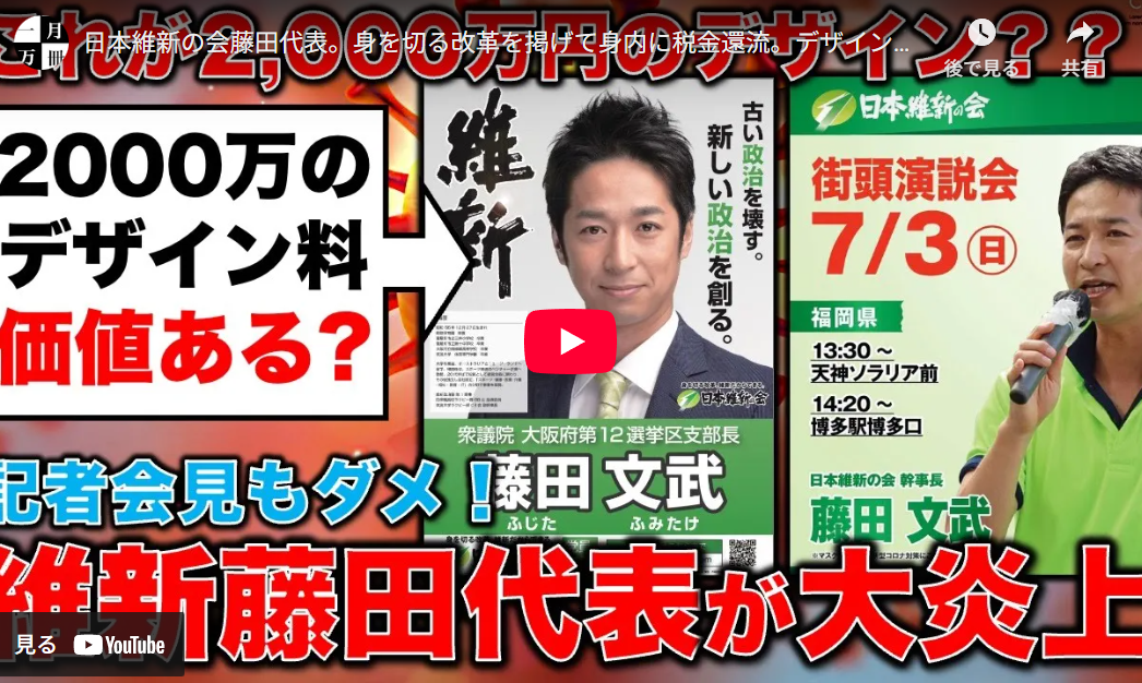 ■日本維新の会藤田代表。身を切る改革を掲げて身内に税金還流。デザイン料2,000万円の価値あるか?