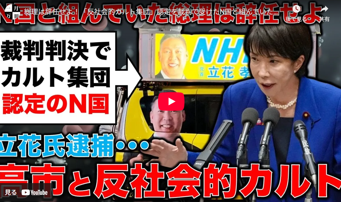 ◆総理は辞任せよ!「反社会的カルト集団」認定を裁判で受けたN国と組んでいた高市早苗内閣