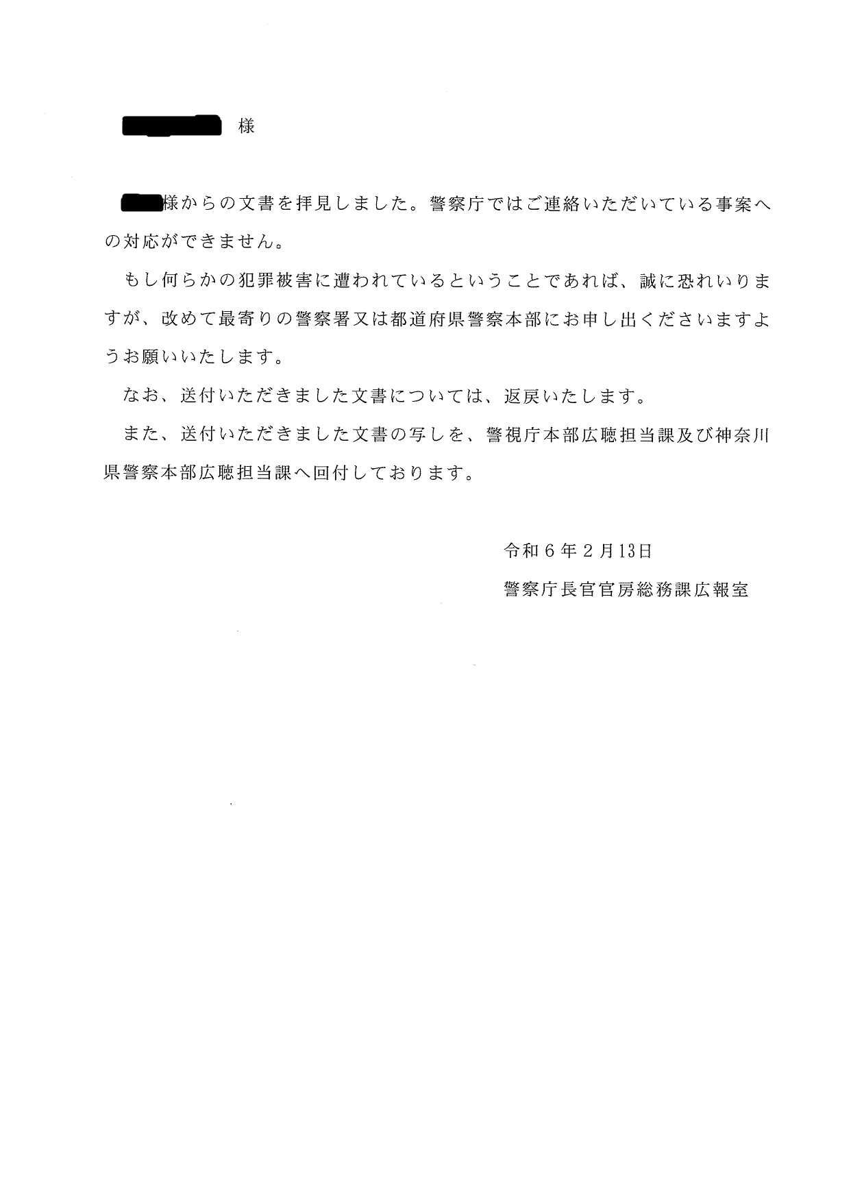 2018年から、捜査機関からの犯罪被害を訴えた手紙を出し続けた返事が、6年かけて初めて、2024年2月16日に届きました。