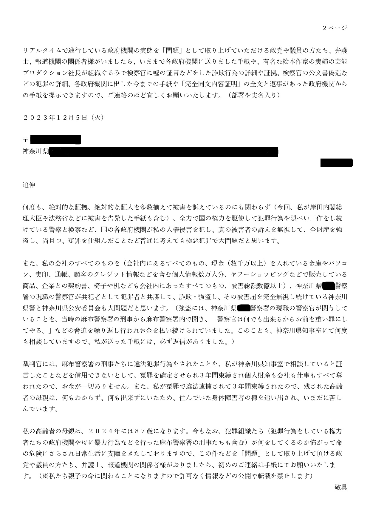 高齢の母を脅迫した手紙1