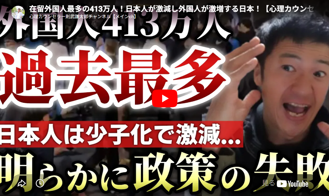 ◆在留外国人最多の413万人!日本人が激減し外国人が激増する日本!【心理カウンセラー則武謙太郎】