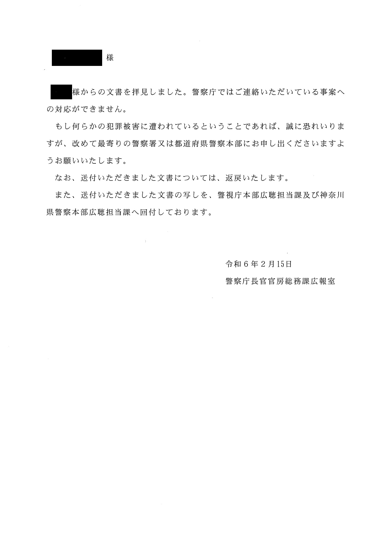 2018年から、捜査機関からの犯罪被害を訴えた手紙を出し続けた返事が、6年かけて初めて、2024年2月16日(警察庁からの手紙1)に届き、再度、2024年2月22日(木)に届きました。(警察庁からの手紙2)